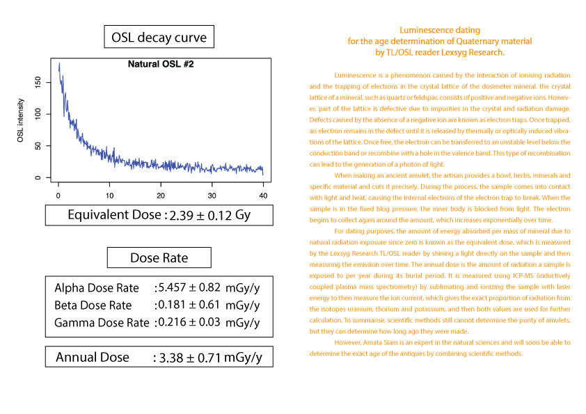 护身符年龄的计算被列为古董之一需要知道护身符从过去到现在累计接受的辐射量 (等效剂量)(Equivalent dose)。这可以由 TL/OSL 读取器 Lexsyg Research 通过对样本应用光来确定。然后随时间测量发光量。以及该护身符每年接受的辐射量(年剂量)(Equivalent dose) 。  这可以从 ICP-MS(电感耦合等离子体质谱仪)机器通过使用激光能量升华和电离样品得知。