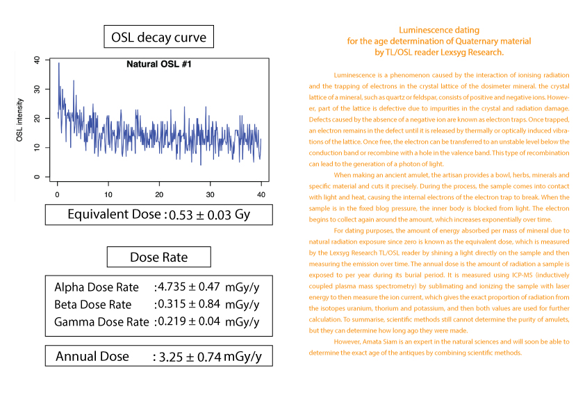 护身符年龄的计算被列为古董之一需要知道护身符从过去到现在累计接受的辐射量 (等效剂量)(Equivalent dose)。这可以由 TL/OSL 读取器 Lexsyg Research 通过对样本应用光来确定。然后随时间测量发光量。以及该护身符每年接受的辐射量(年剂量)(Equivalent dose) 。 这可以从 ICP-MS(电感耦合等离子体质谱仪)机器通过使用激光能量升华和电离样品得知。