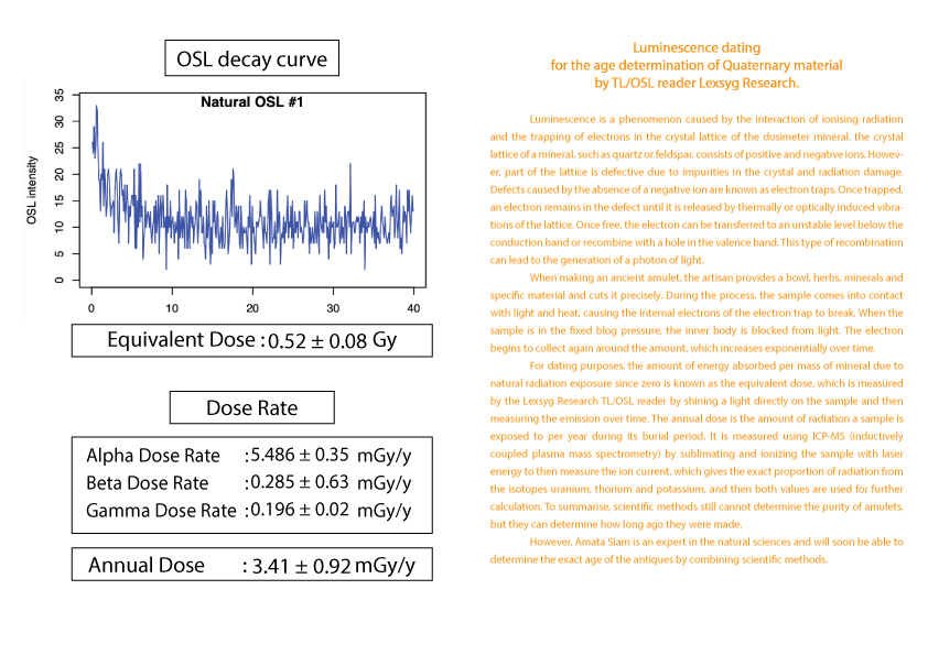 护身符年龄的计算被列为古董之一需要知道护身符从过去到现在累计接受的辐射量 (等效剂量)(Equivalent dose)。这可以由 TL/OSL 读取器 Lexsyg Research 通过对样本应用光来确定。然后随时间测量发光量。以及该护身符每年接受的辐射量(年剂量)(Equivalent dose) 。 这可以从 ICP-MS(电感耦合等离子体质谱仪)机器通过使用激光能量升华和电离样品得知。