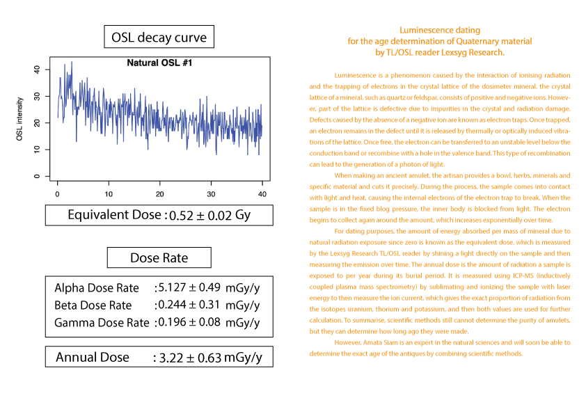 护身符年龄的计算被列为古董之一需要知道护身符从过去到现在累计接受的辐射量 (等效剂量)(Equivalent dose)。这可以由 TL/OSL 读取器 Lexsyg Research 通过对样本应用光来确定。然后随时间测量发光量。以及该护身符每年接受的辐射量(年剂量)(Equivalent dose) 。  这可以从 ICP-MS(电感耦合等离子体质谱仪)机器通过使用激光能量升华和电离样品得知。