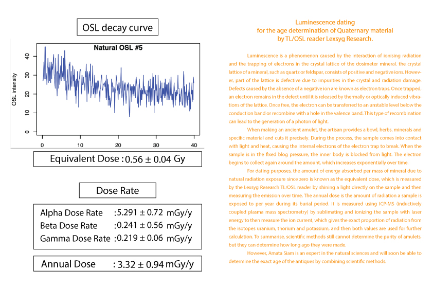 护身符年龄的计算被列为古董之一需要知道护身符从过去到现在累计接受的辐射量 (等效剂量)(Equivalent dose)。这可以由 TL/OSL 读取器 Lexsyg Research 通过对样本应用光来确定。然后随时间测量发光量。以及该护身符每年接受的辐射量(年剂量)(Equivalent dose) 。  这可以从 ICP-MS(电感耦合等离子体质谱仪)机器通过使用激光能量升华和电离样品得知。