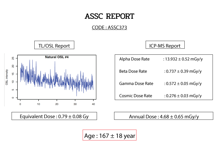 For dating, the amount of absorbed energy per mass of mineral due to natural radiation exposure since zeroing is known as the Equivalent dose which is measured by TL/OSL reader Lexsyg Research by using a light to stimulate directly to the sample then measuring it emit due to time. And the Annual dose is the amount of radiation that a sample is exposed to per annum during its burial period measure by ICP-MS (Inductively Coupled Plasma Mass Spectrometry) by using an energy from laser to sublimate the sample and ionized then measure the ion current which is precisely proportion of isotopes radiation which are Uranium, Thorium and Potassium then we bring both value for the further calculation.