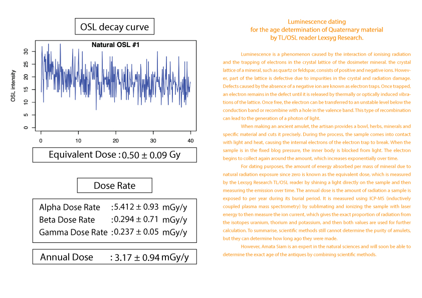 护身符年龄的计算被列为古董之一需要知道护身符从过去到现在累计接受的辐射量 (等效剂量)(Equivalent dose)。这可以由 TL/OSL 读取器 Lexsyg Research 通过对样本应用光来确定。然后随时间测量发光量。以及该护身符每年接受的辐射量(年剂量)(Equivalent dose) 。  这可以从 ICP-MS(电感耦合等离子体质谱仪)机器通过使用激光能量升华和电离样品得知。