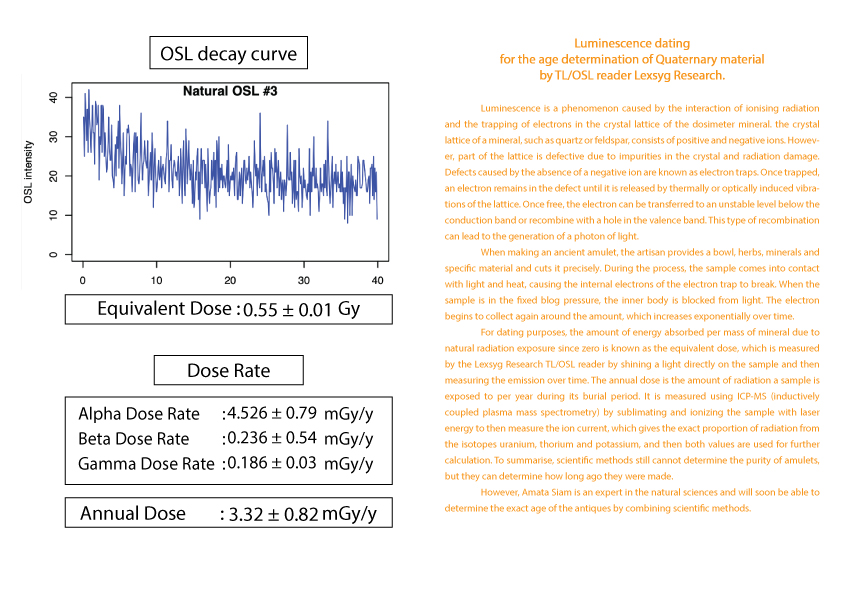 护身符年龄的计算被列为古董之一需要知道护身符从过去到现在累计接受的辐射量 (等效剂量)(Equivalent dose)。这可以由 TL/OSL 读取器 Lexsyg Research 通过对样本应用光来确定。然后随时间测量发光量。以及该护身符每年接受的辐射量(年剂量)(Equivalent dose) 。 这可以从 ICP-MS(电感耦合等离子体质谱仪)机器通过使用激光能量升华和电离样品得知。
