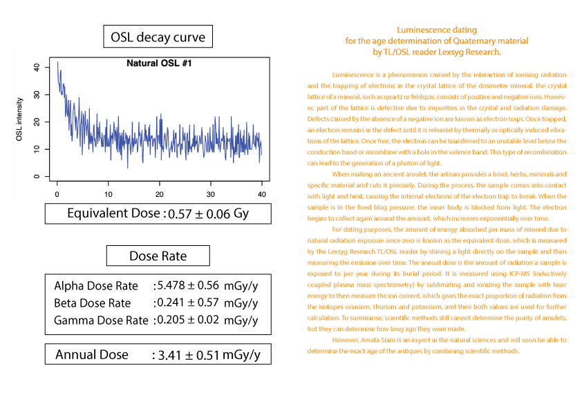 护身符年龄的计算被列为古董之一需要知道护身符从过去到现在累计接受的辐射量 (等效剂量)(Equivalent dose)。这可以由 TL/OSL 读取器 Lexsyg Research 通过对样本应用光来确定。然后随时间测量发光量。以及该护身符每年接受的辐射量(年剂量)(Equivalent dose) 。 这可以从 ICP-MS(电感耦合等离子体质谱仪)机器通过使用激光能量升华和电离样品得知。