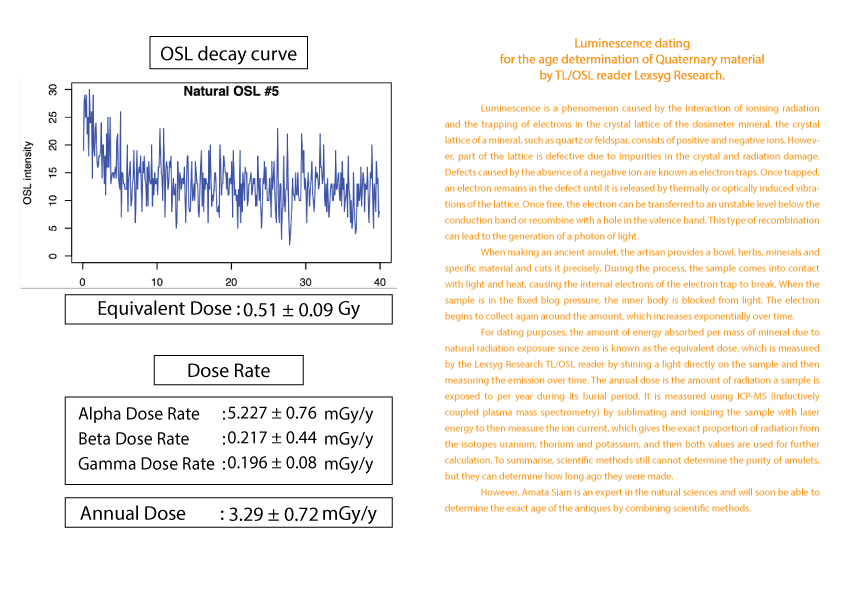 护身符年龄的计算被列为古董之一需要知道护身符从过去到现在累计接受的辐射量 (等效剂量)(Equivalent dose)。这可以由 TL/OSL 读取器 Lexsyg Research 通过对样本应用光来确定。然后随时间测量发光量。以及该护身符每年接受的辐射量(年剂量)(Equivalent dose) 。 这可以从 ICP-MS(电感耦合等离子体质谱仪)机器通过使用激光能量升华和电离样品得知。