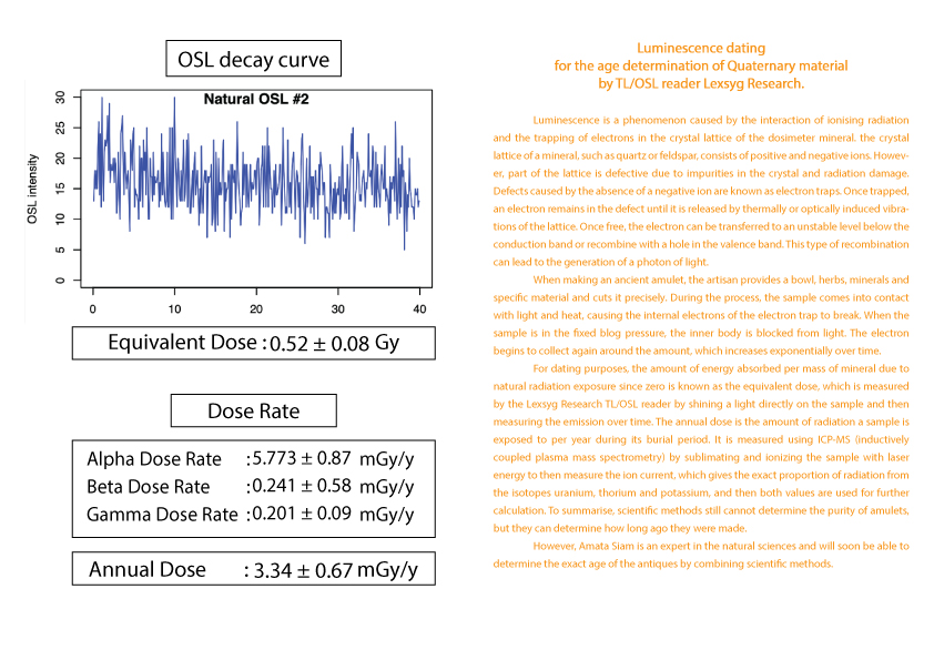 护身符年龄的计算被列为古董之一需要知道护身符从过去到现在累计接受的辐射量 (等效剂量)(Equivalent dose)。这可以由 TL/OSL 读取器 Lexsyg Research 通过对样本应用光来确定。然后随时间测量发光量。以及该护身符每年接受的辐射量(年剂量)(Equivalent dose) 。 这可以从 ICP-MS(电感耦合等离子体质谱仪)机器通过使用激光能量升华和电离样品得知。