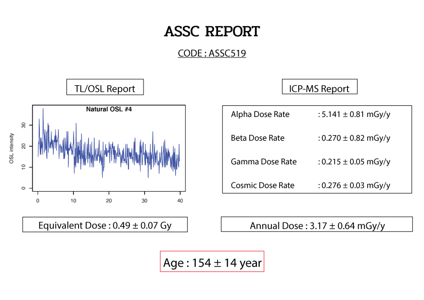 For dating, the amount of absorbed energy per mass of mineral due to natural radiation exposure since zeroing is known as the Equivalent dose which is measured by TL/OSL reader Lexsyg Research by using a light to stimulate directly to the sample then measuring it emit due to time. And the Annual dose is the amount of radiation that a sample is exposed to per annum during its burial period measure by ICP-MS (Inductively Coupled Plasma Mass Spectrometry) by using an energy from laser to sublimate the sample and ionized then measure the ion current which is precisely proportion of isotopes radiation which are Uranium, Thorium and Potassium then we bring both value for the further calculation.