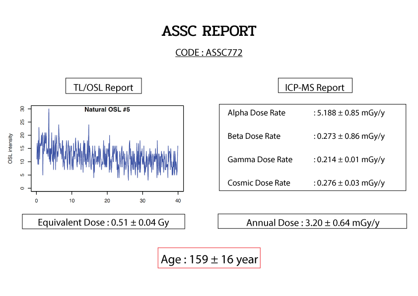 For dating, the amount of absorbed energy per mass of mineral due to natural radiation exposure since zeroing is known as the Equivalent dose which is measured by TL/OSL reader Lexsyg Research by using a light to stimulate directly to the sample then measuring it emit due to time. And the Annual dose is the amount of radiation that a sample is exposed to per annum during its burial period measure by ICP-MS (Inductively Coupled Plasma Mass Spectrometry) by using an energy from laser to sublimate the sample and ionized then measure the ion current which is precisely proportion of isotopes radiation which are Uranium, Thorium and Potassium then we bring both value for the further calculation.