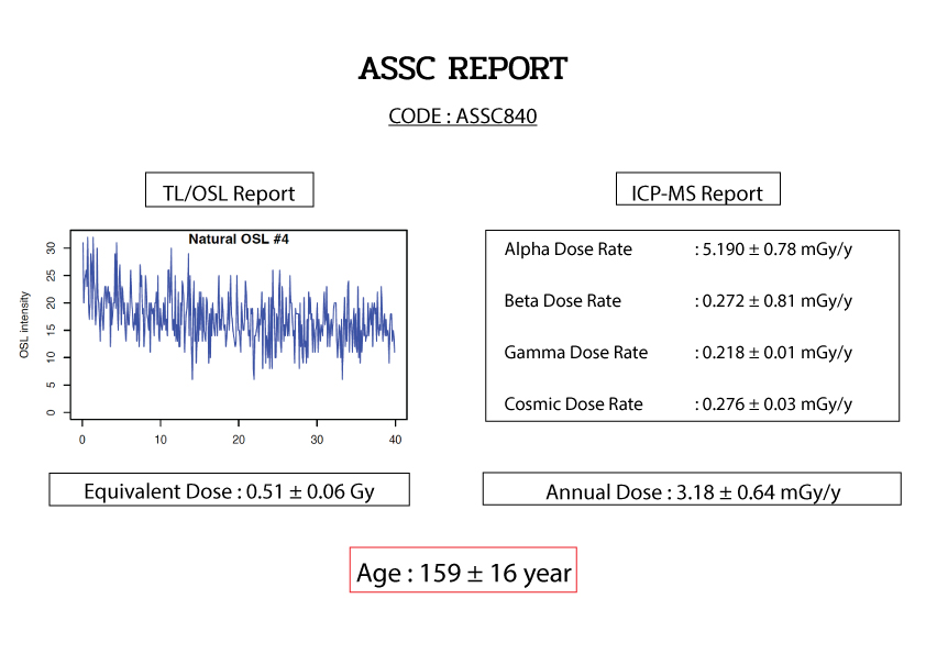 For dating, the amount of absorbed energy per mass of mineral due to natural radiation exposure since zeroing is known as the Equivalent dose which is measured by TL/OSL reader Lexsyg Research by using a light to stimulate directly to the sample then measuring it emit due to time. And the Annual dose is the amount of radiation that a sample is exposed to per annum during its burial period measure by ICP-MS (Inductively Coupled Plasma Mass Spectrometry) by using an energy from laser to sublimate the sample and ionized then measure the ion current which is precisely proportion of isotopes radiation which are Uranium, Thorium and Potassium then we bring both value for the further calculation.