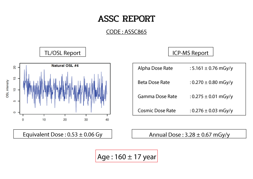 For dating, the amount of absorbed energy per mass of mineral due to natural radiation exposure since zeroing is known as the Equivalent dose which is measured by TL/OSL reader Lexsyg Research by using a light to stimulate directly to the sample then measuring it emit due to time. And the Annual dose is the amount of radiation that a sample is exposed to per annum during its burial period measure by ICP-MS (Inductively Coupled Plasma Mass Spectrometry) by using an energy from laser to sublimate the sample and ionized then measure the ion current which is precisely proportion of isotopes radiation which are Uranium, Thorium and Potassium then we bring both value for the further calculation.