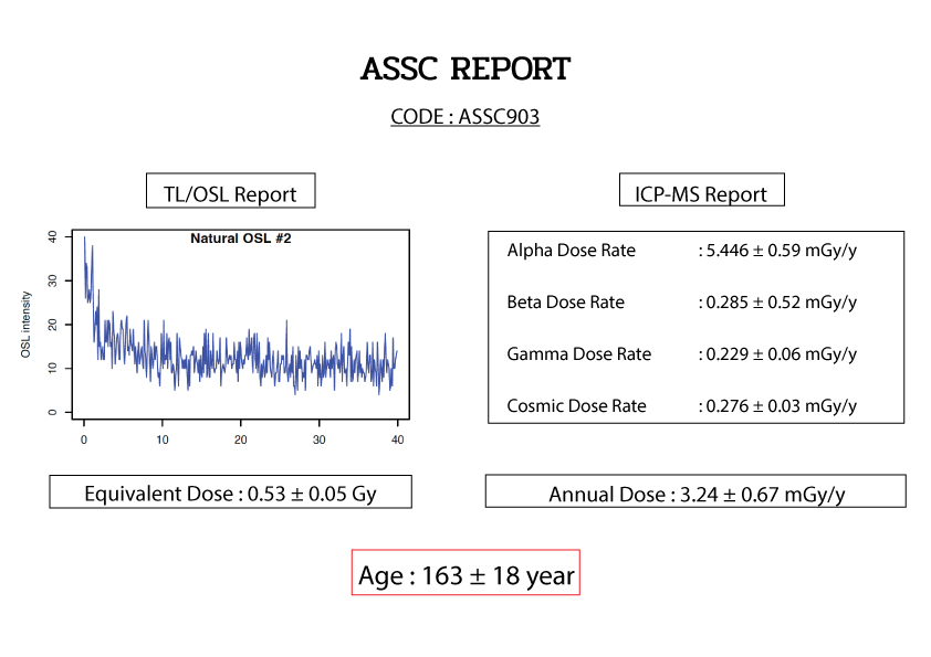 For dating, the amount of absorbed energy per mass of mineral due to natural radiation exposure since zeroing is known as the Equivalent dose which is measured by TL/OSL reader Lexsyg Research by using a light to stimulate directly to the sample then measuring it emit due to time. And the Annual dose is the amount of radiation that a sample is exposed to per annum during its burial period measure by ICP-MS (Inductively Coupled Plasma Mass Spectrometry) by using an energy from laser to sublimate the sample and ionized then measure the ion current which is precisely proportion of isotopes radiation which are Uranium, Thorium and Potassium then we bring both value for the further calculation.